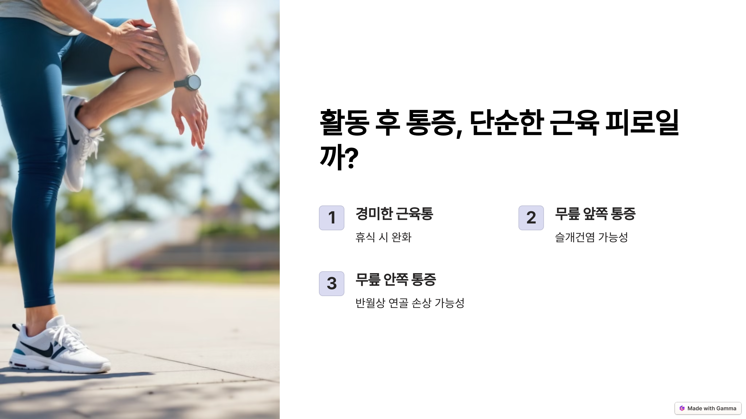 운동 후 무릎이 아프다면, 단순한 피로일 수도 있지만 **무릎에 무리가 갔다는 신호**일 수도 있어요.