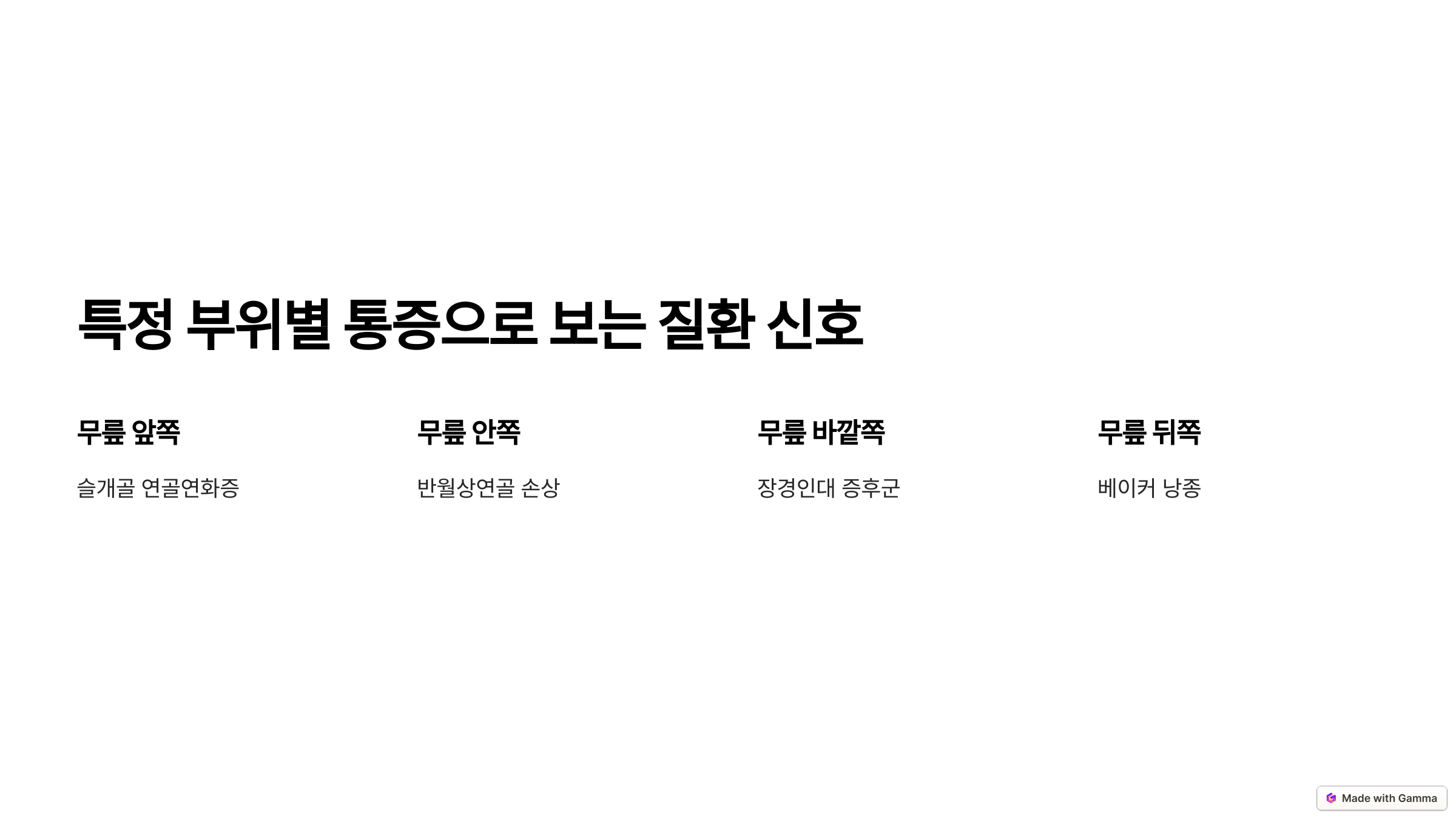 - 무릎 안쪽 통증: 반월상 연골 손상 가능성 (걸을 때 삐걱거리는 느낌)