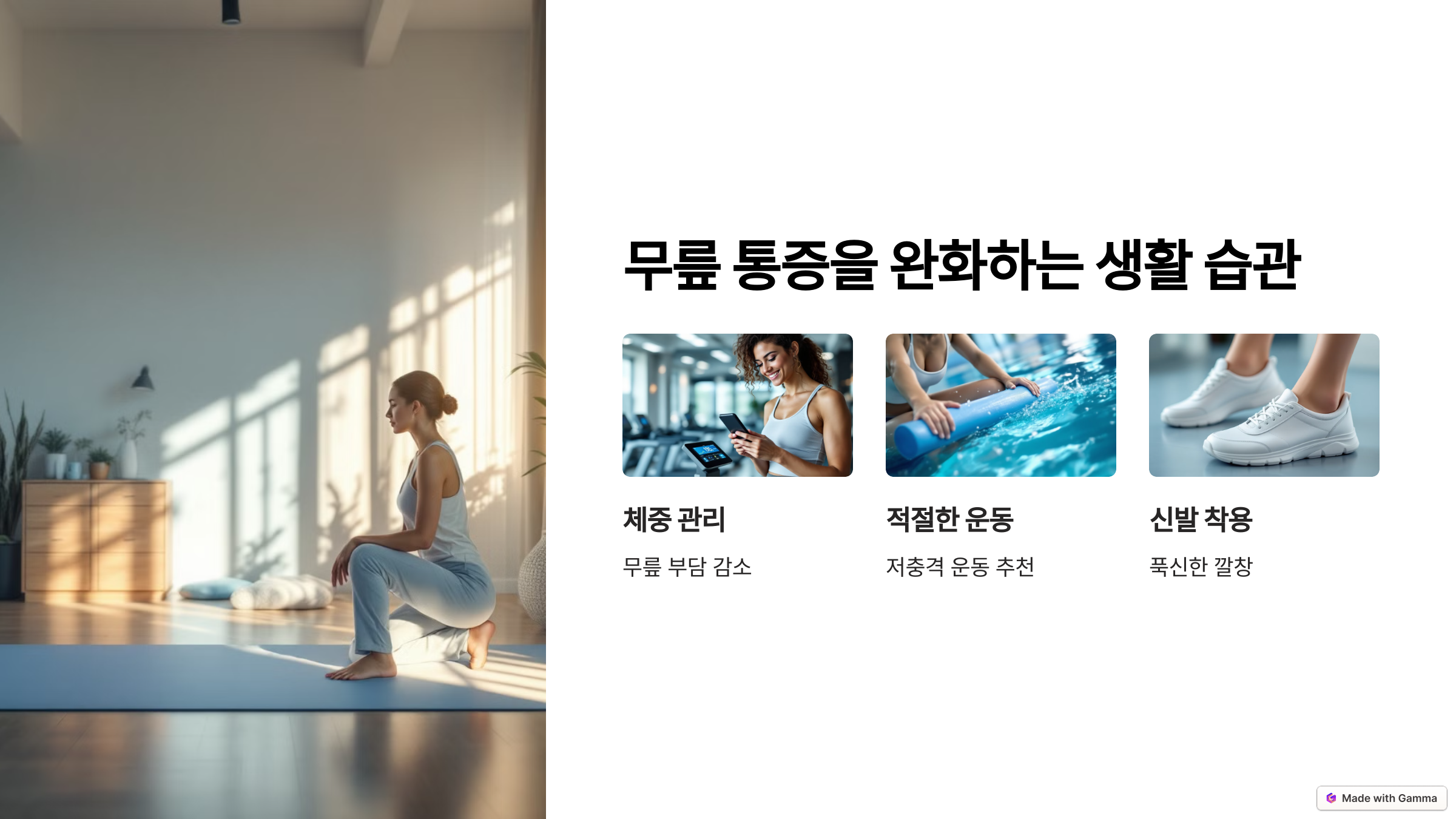 무릎이 아프다고 완전히 쉬는 것보다, 가벼운 운동으로 근력을 유지하는 것이 중요해요.