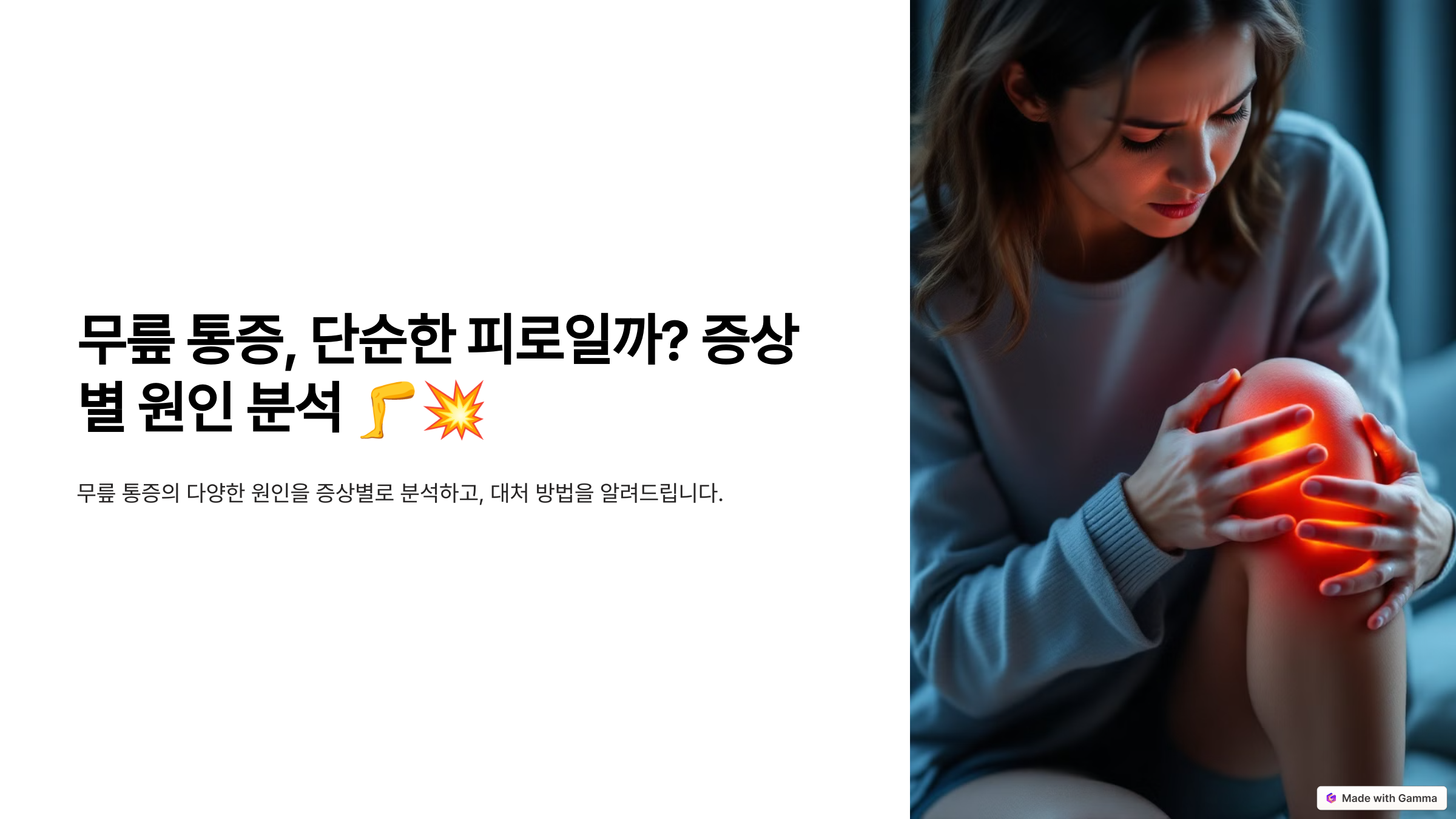 무릎이 아플 때, 단순한 피로 때문인지 아니면 심각한 질환의 신호인지 고민될 때가 많죠. 특히 날씨가 바뀌거나 운동 후에 통증이 심해진다면 더 신경이 쓰일 수밖에 없습니다. 오늘은 무릎 통증의 다양한 원인을 증상별로 분석하고, 이에 대한 대처 방법을 알려드릴게요!